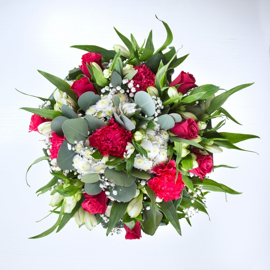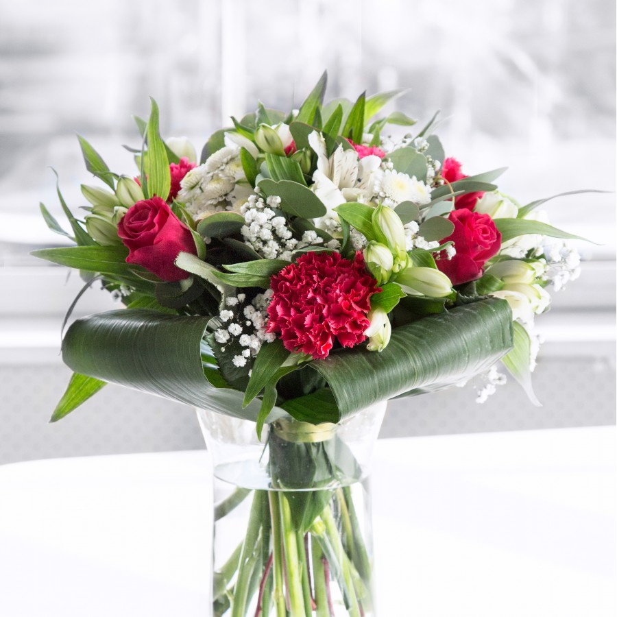 Embrace the charm and uniqueness of our stunning bouquet, combining white chrysanthemums, delicate gypsophila, vibrant red roses, lively carnations, elegant white alstroemeria, and rich aspidistra leaves. Each flower is hand-picked to ensure supreme freshness and quality.